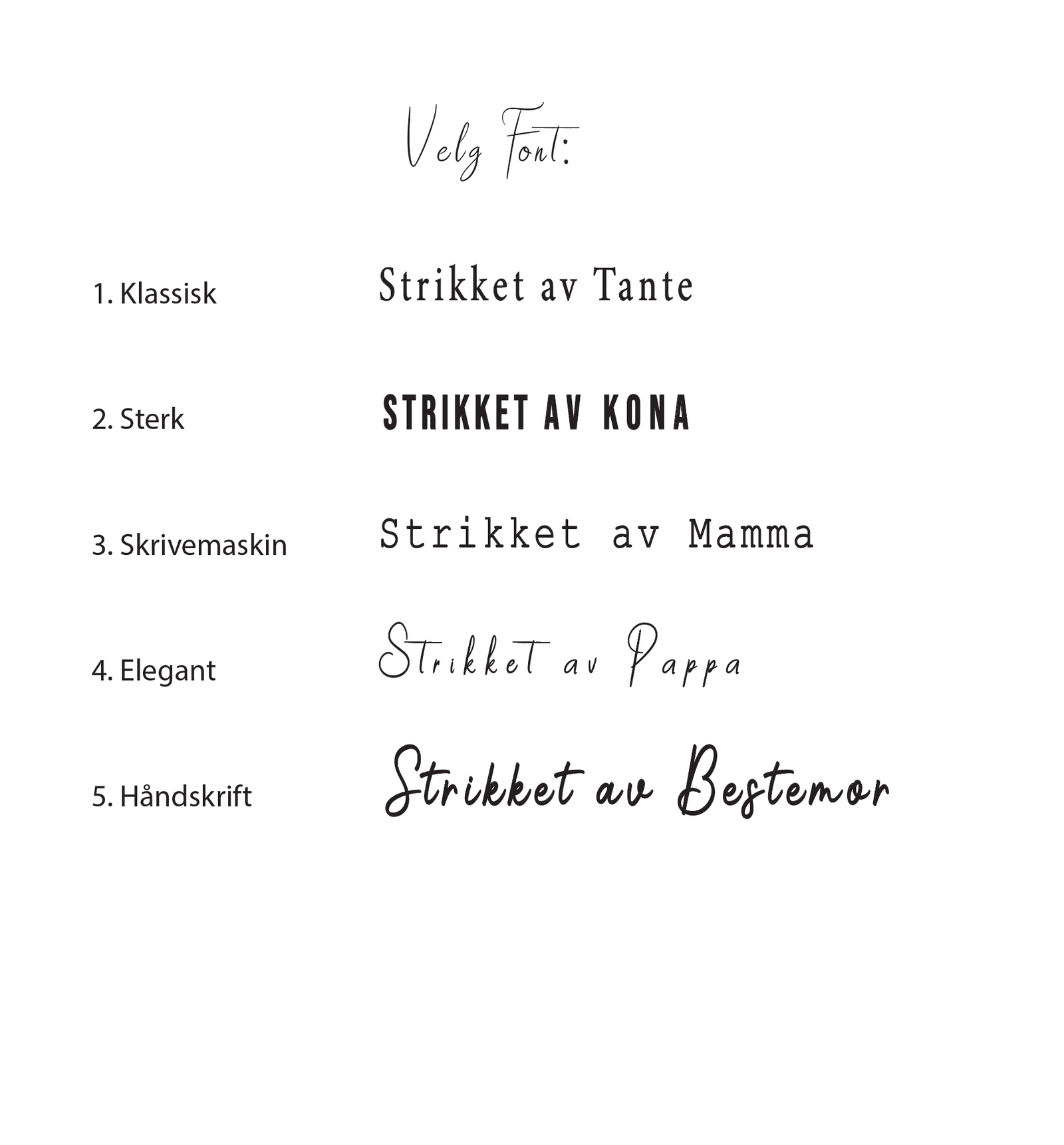1. Myriad, 2. Sterk, 3. Skrivemaskin, 4. Elegant, 5. Håndskrift