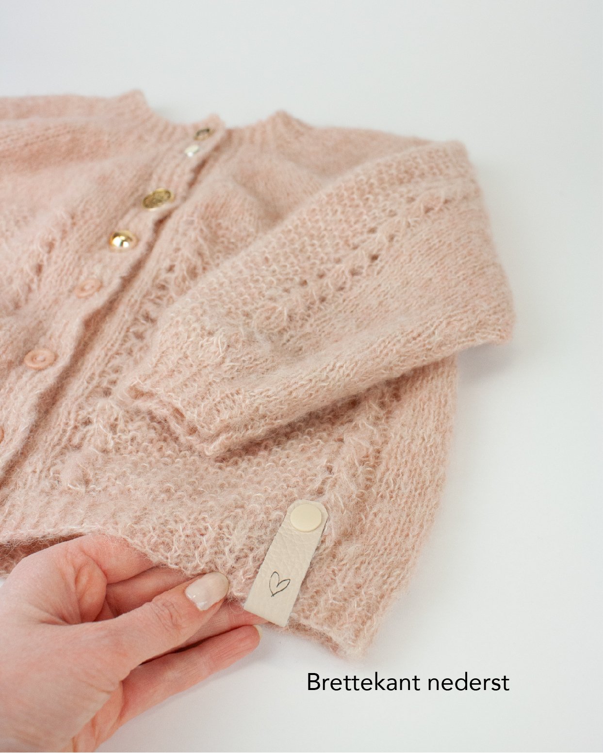 • Bruk en strikkepinne cirka 5 mm, stikk pinnen mellom masker for å dra maskene fra hverandre. Stikk bakdelen av lappen gjennom maskene. Fest forstykket i skinn til bakdelen ved å kneppe knapper sammen – voila! Lappen er festet på strikketøyet.