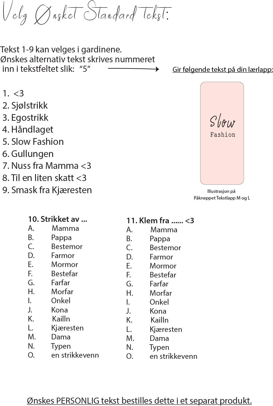 - Velg standard tekst, kvantum og skinnfarge i gardinene. Alternativ tekst kan velges, skriv nummeret på ønsket tekst i tekstfeltet (- kun standard tekst fra oversiktsbildet!)