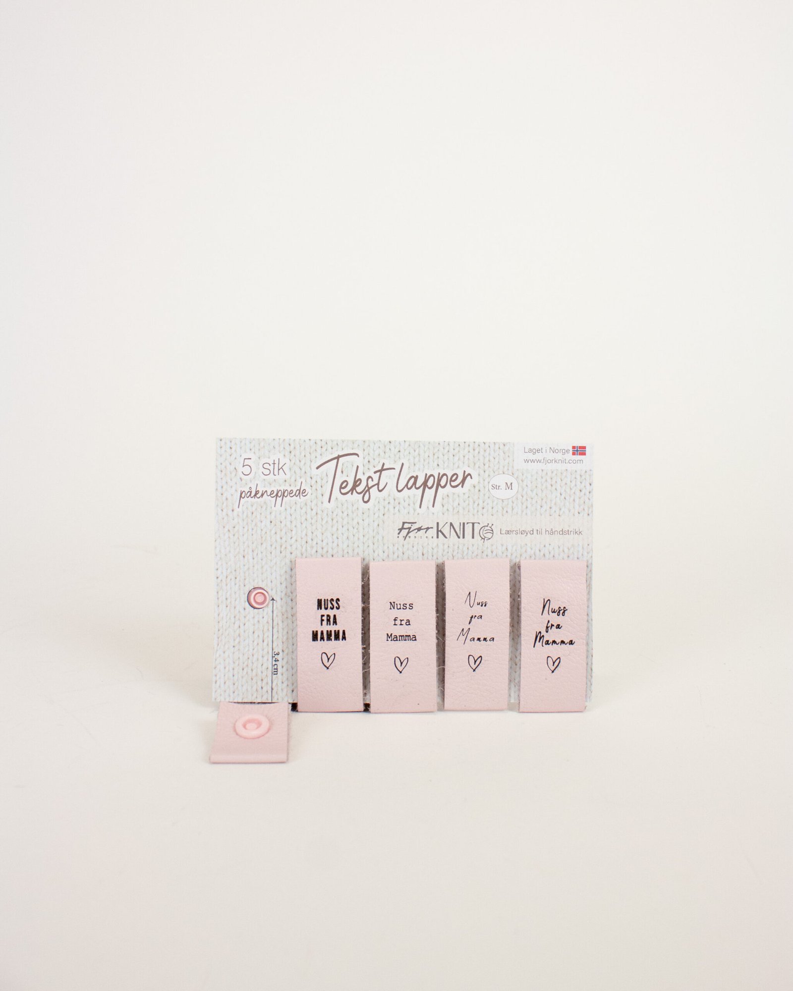- Størrelsen på den ferdig brettede lappen tilsvarer høyden og lengden du finner ovenfor. Lappen når ca 4 cm inn i strikketøyet når kneppet på.