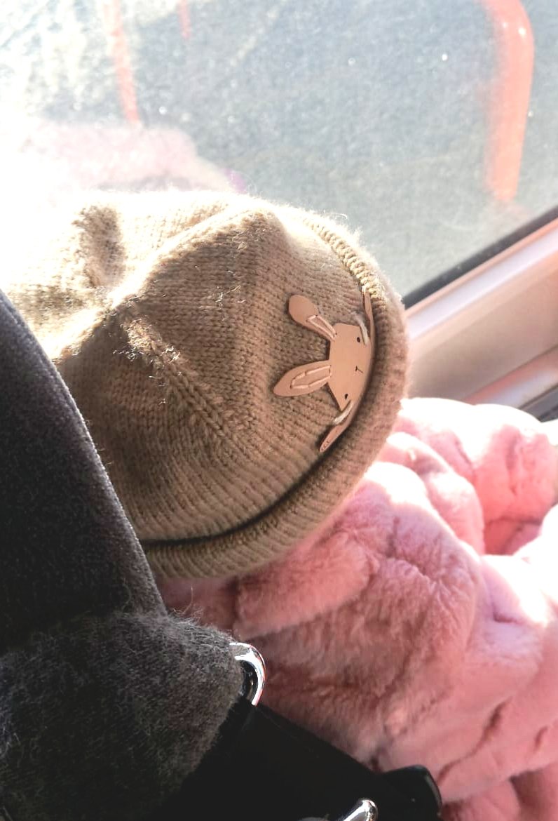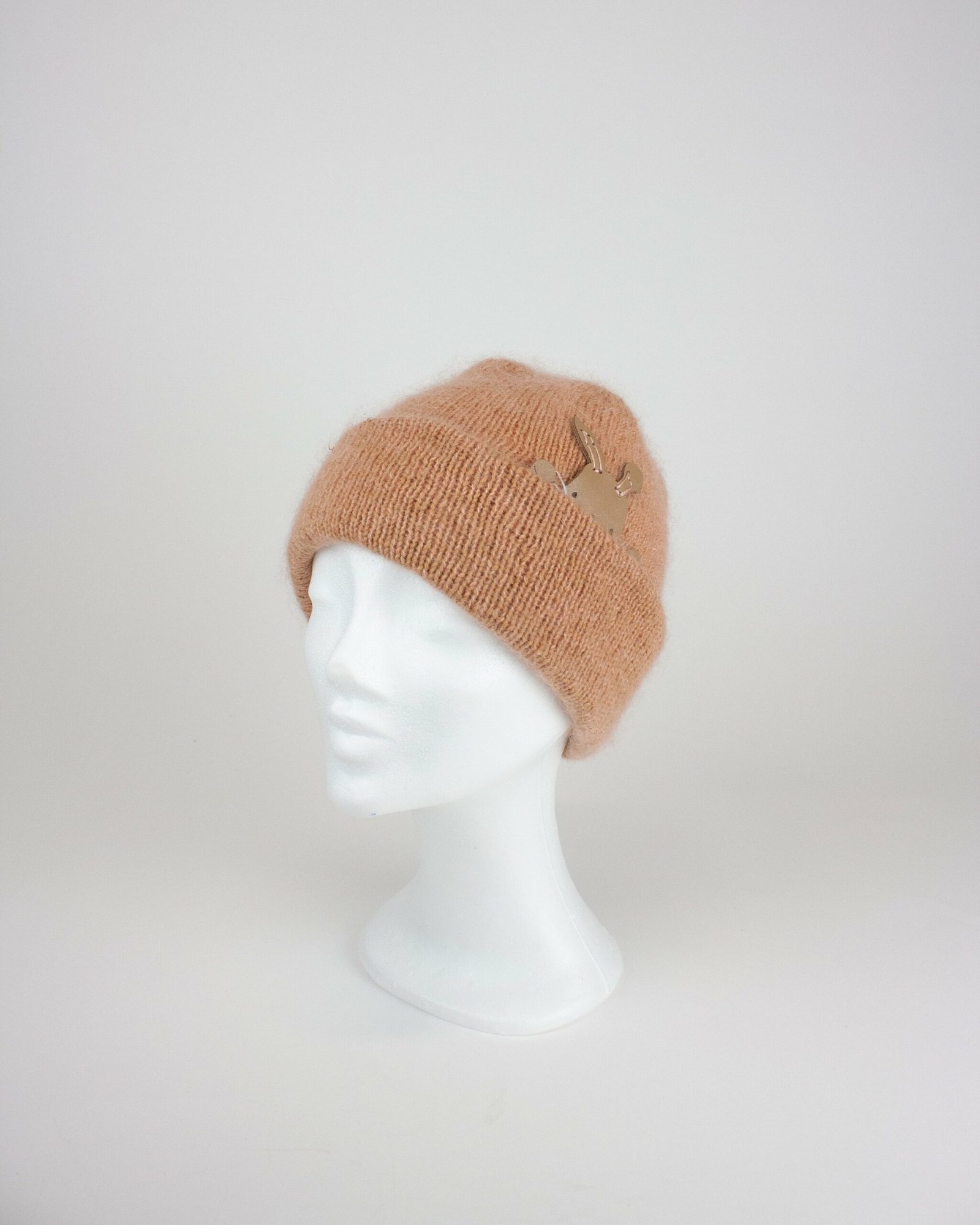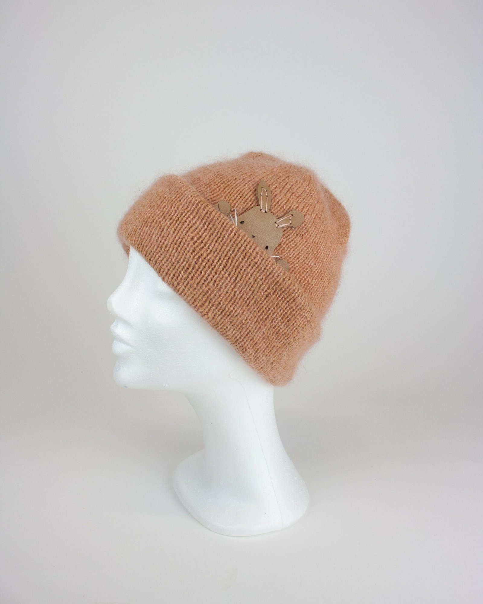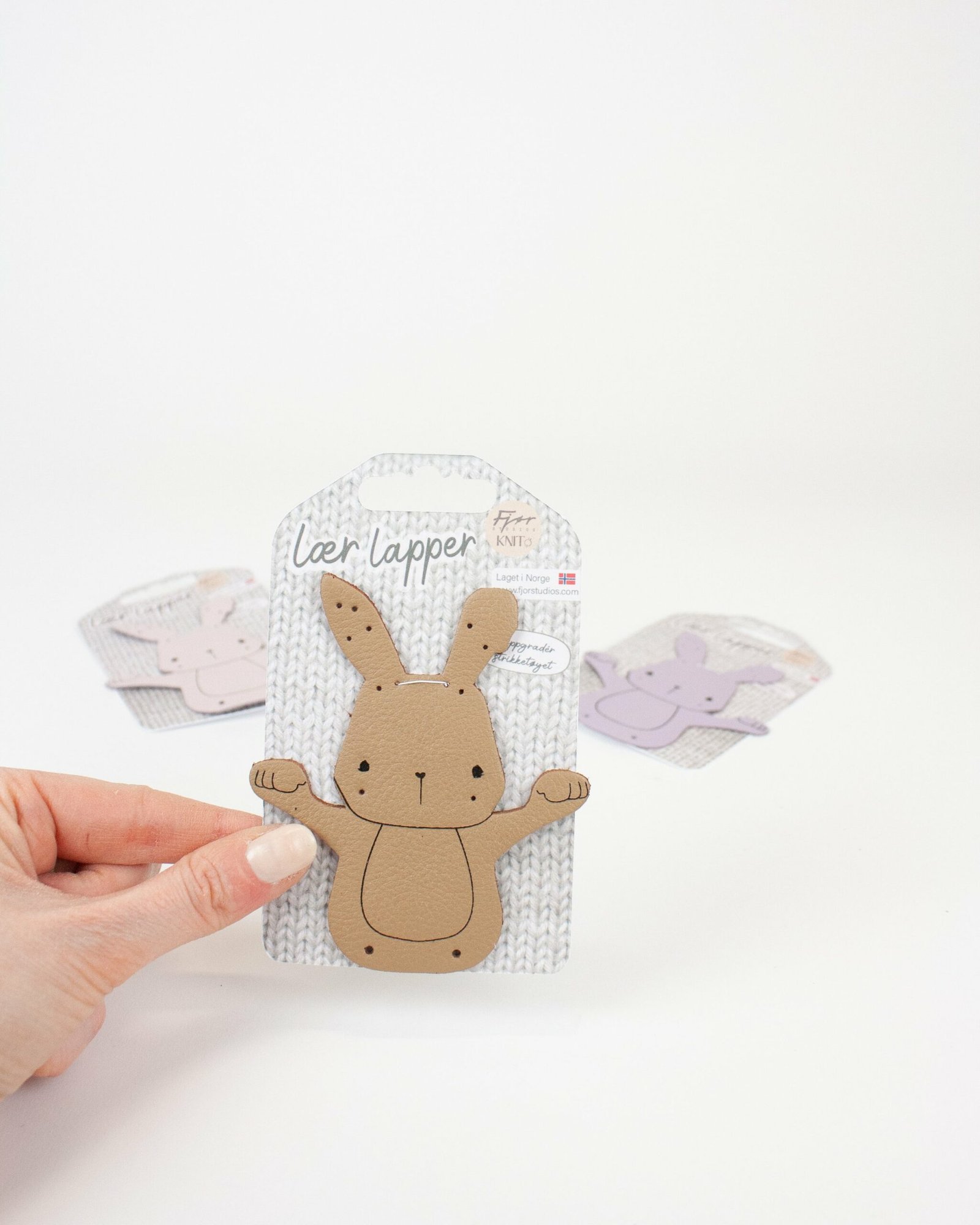 Dekorativ lærlapp med kaninmotiv. Beregnet for å syes innenfor brettekanten på luer med oppbrettskant.